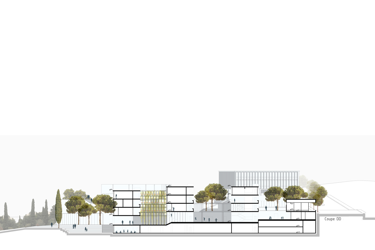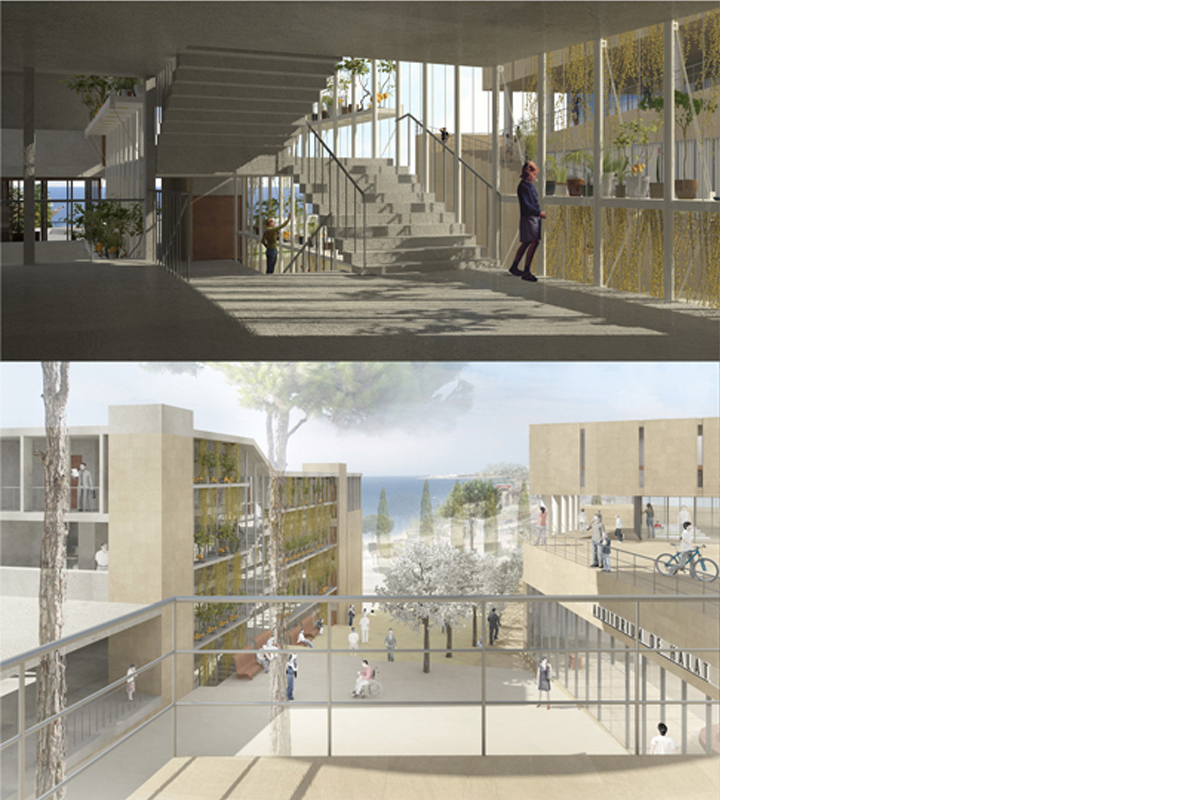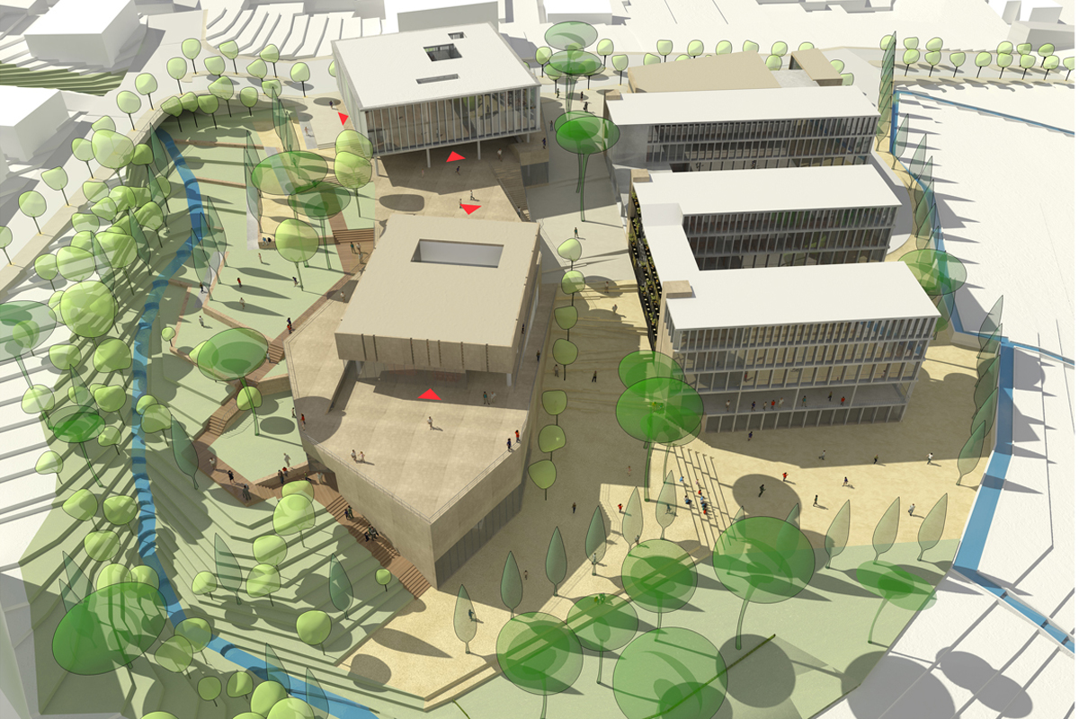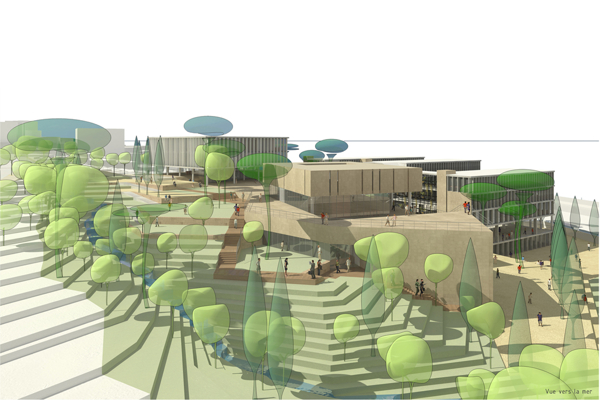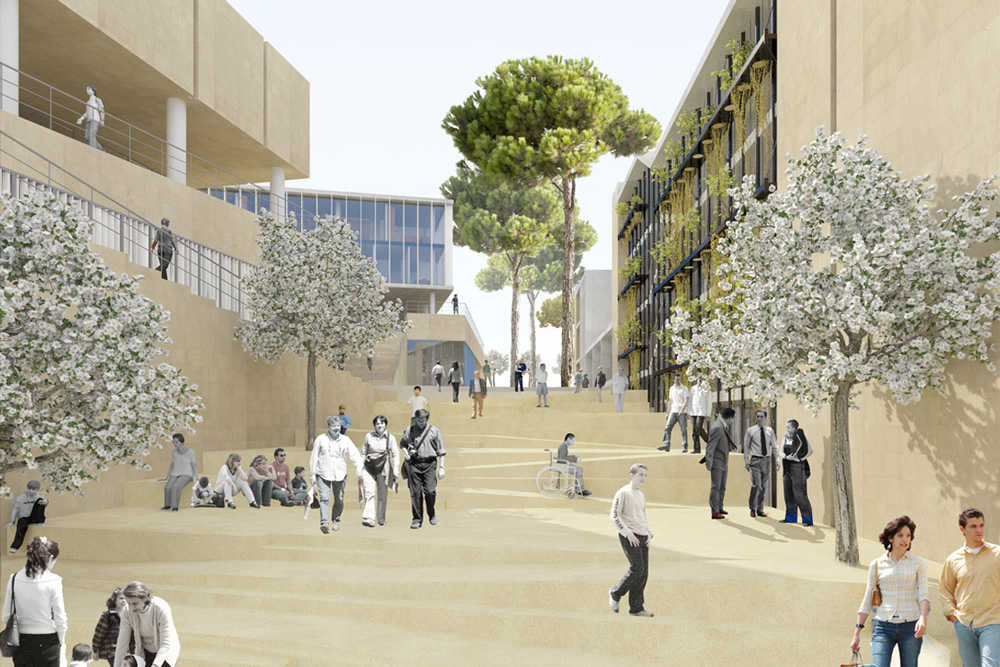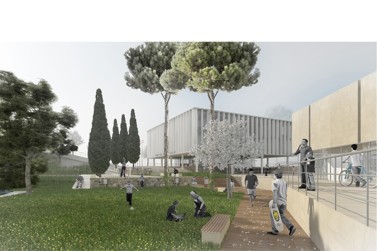 Awarded 1st prize. The idea behind this project’s initiation was to restore the qualities of the landscape of the site: The topography smoothly flowing towards the sea and the horizon, the watercourse running along the northern edge of the site, and the irrigation channels encapsulating it from east and south. Highlighting these elements of the landscape reclaims the essential character of the site, which makes for an advantage in staging of the project. The ground level is broken up to follow the topography of the site, thus reconstructing the profile of the valley. The terraces are organized into three typological entities: the public square, the pedestrian street, and the playgrounds. The civic spaces of the project occur above and below the square, which borders the embankment of a small valley, upstream from the site. The educational complex occupies the lower part on the western side of the site. These two areas are separated by a pedestrian street that crosses the site along the North-South axis and distributes the elements of the program.