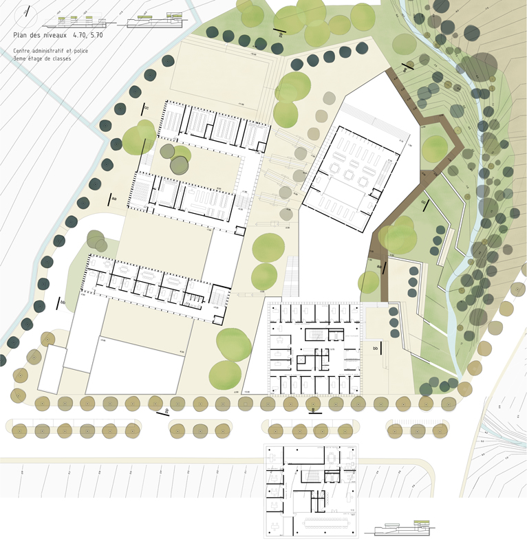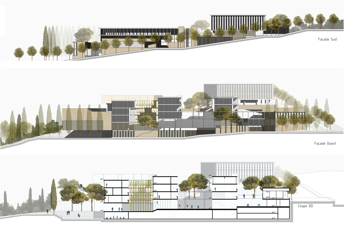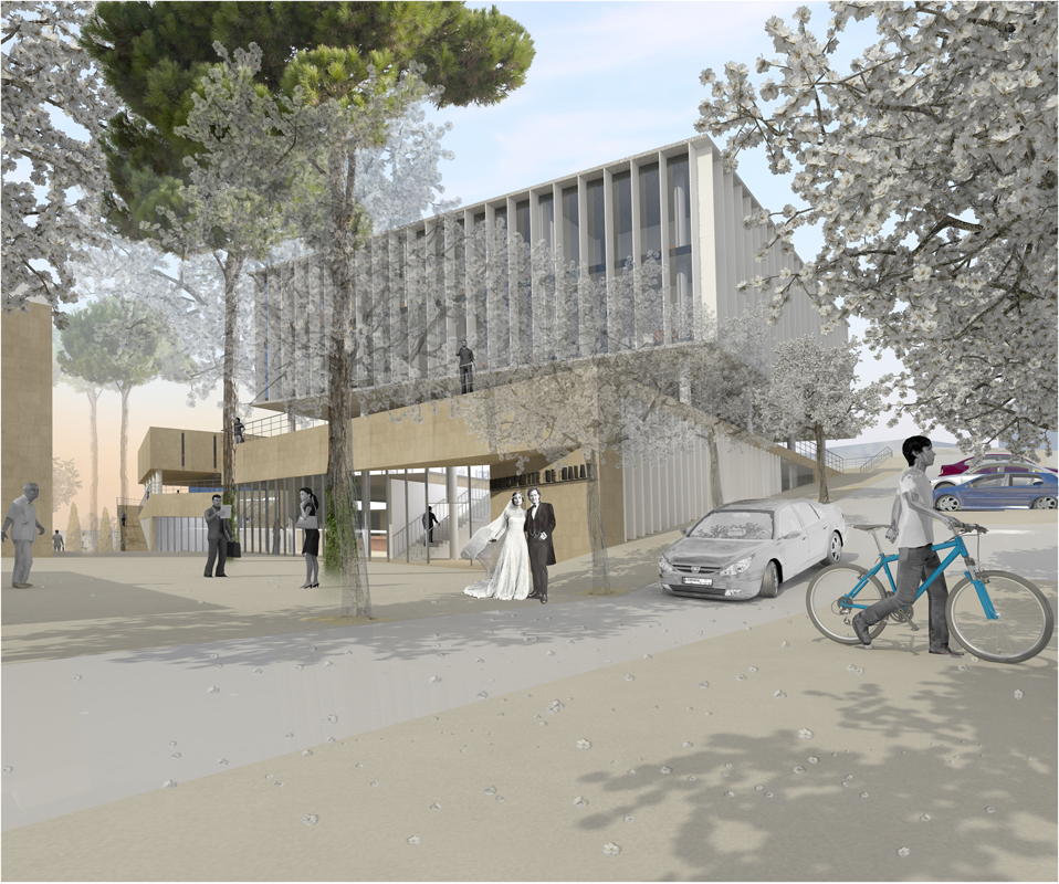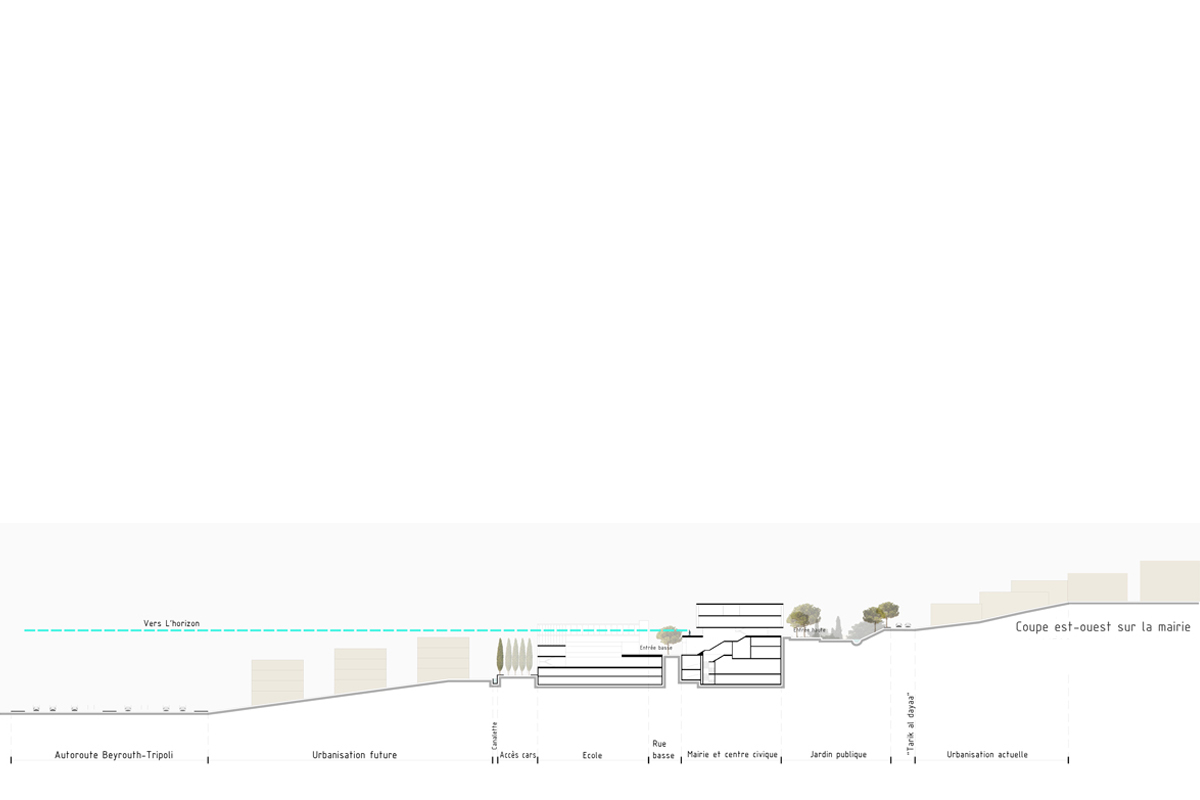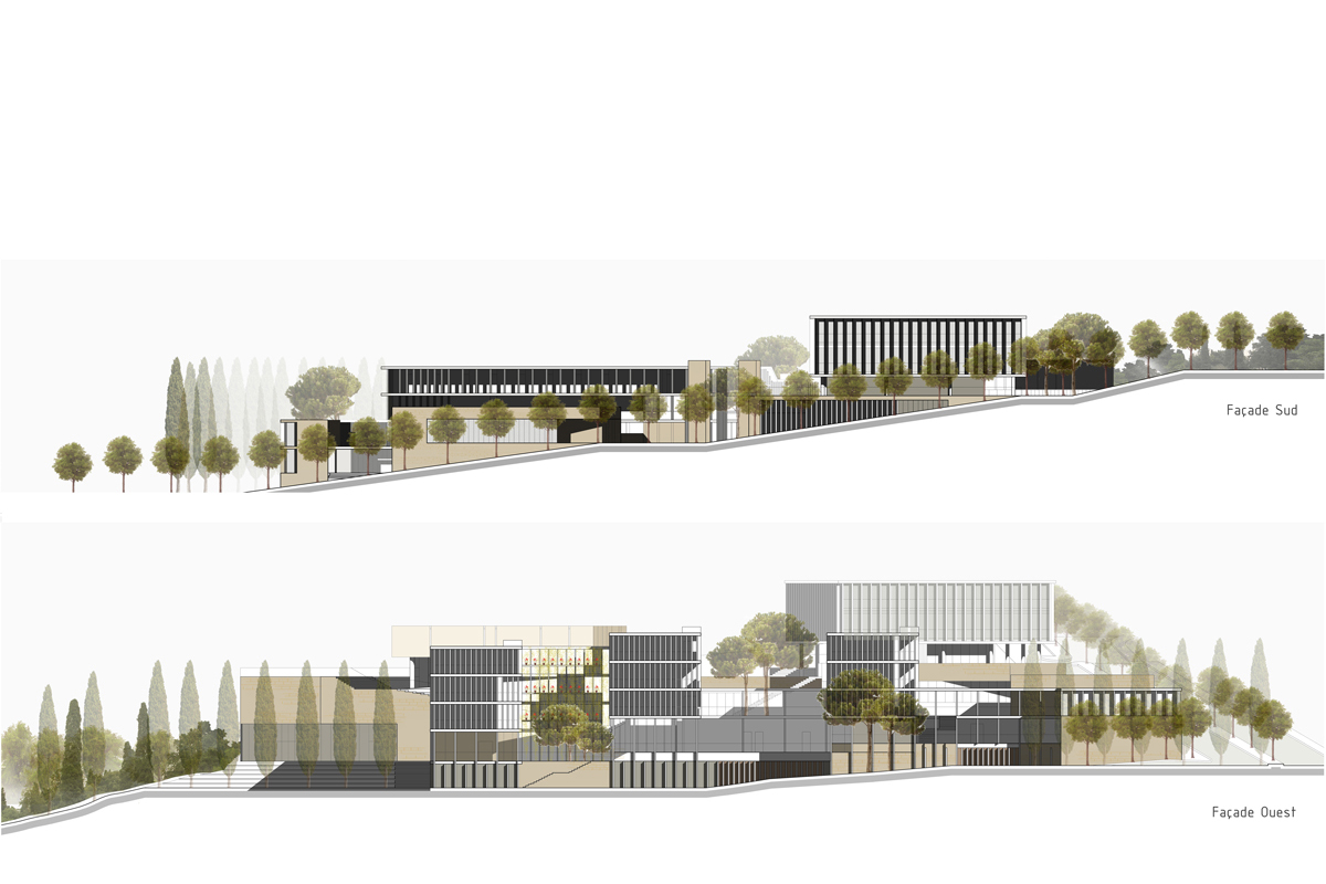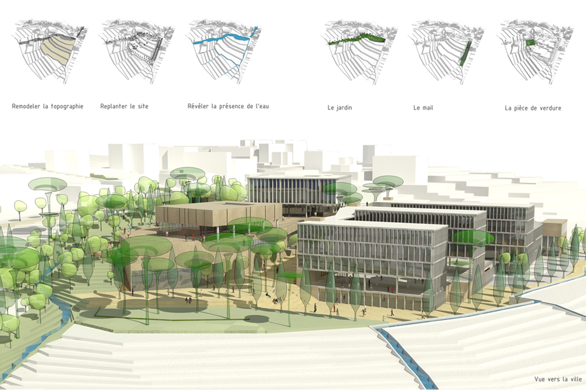 Awarded 1st prize. The idea behind this project’s initiation was to restore the qualities of the landscape of the site: The topography smoothly flowing towards the sea and the horizon, the watercourse running along the northern edge of the site, and the irrigation channels encapsulating it from east and south. Highlighting these elements of the landscape reclaims the essential character of the site, which makes for an advantage in staging of the project. The ground level is broken up to follow the topography of the site, thus reconstructing the profile of the valley. The terraces are organized into three typological entities: the public square, the pedestrian street, and the playgrounds. The civic spaces of the project occur above and below the square, which borders the embankment of a small valley, upstream from the site. The educational complex occupies the lower part on the western side of the site. These two areas are separated by a pedestrian street that crosses the site along the North-South axis and distributes the elements of the program.