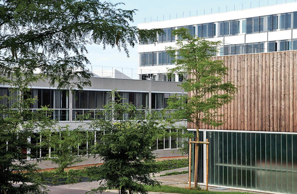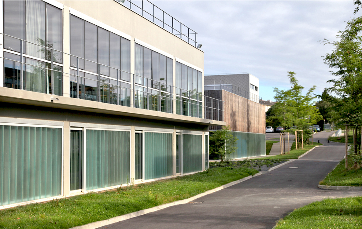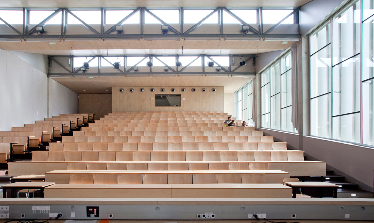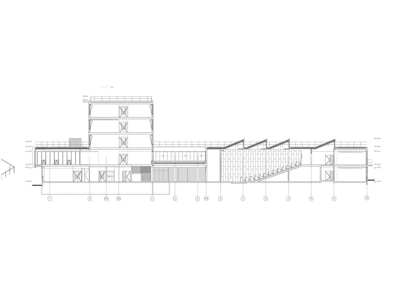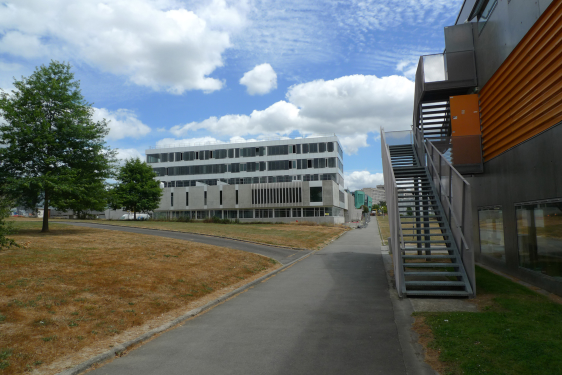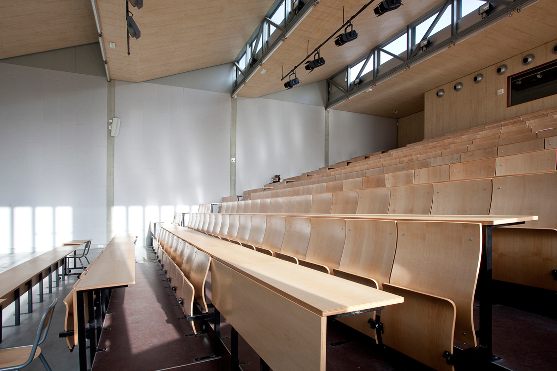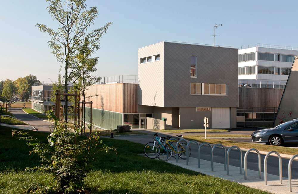 In partnership with Claude Montfort. The project consists of a research and lecture building, sport facilities, and a guard house. The common base of the building is dedicated to the teaching spaces, classrooms, and the auditorium, while the sport facilities are housed in the extension to the existing facility. An interior courtyard creates the unity of the structures and allows visual relations between the classrooms and the dance and judo studios. The guard house is set on top of the sport facilities, on the north side of the site, as a form of small-scale watching tower.