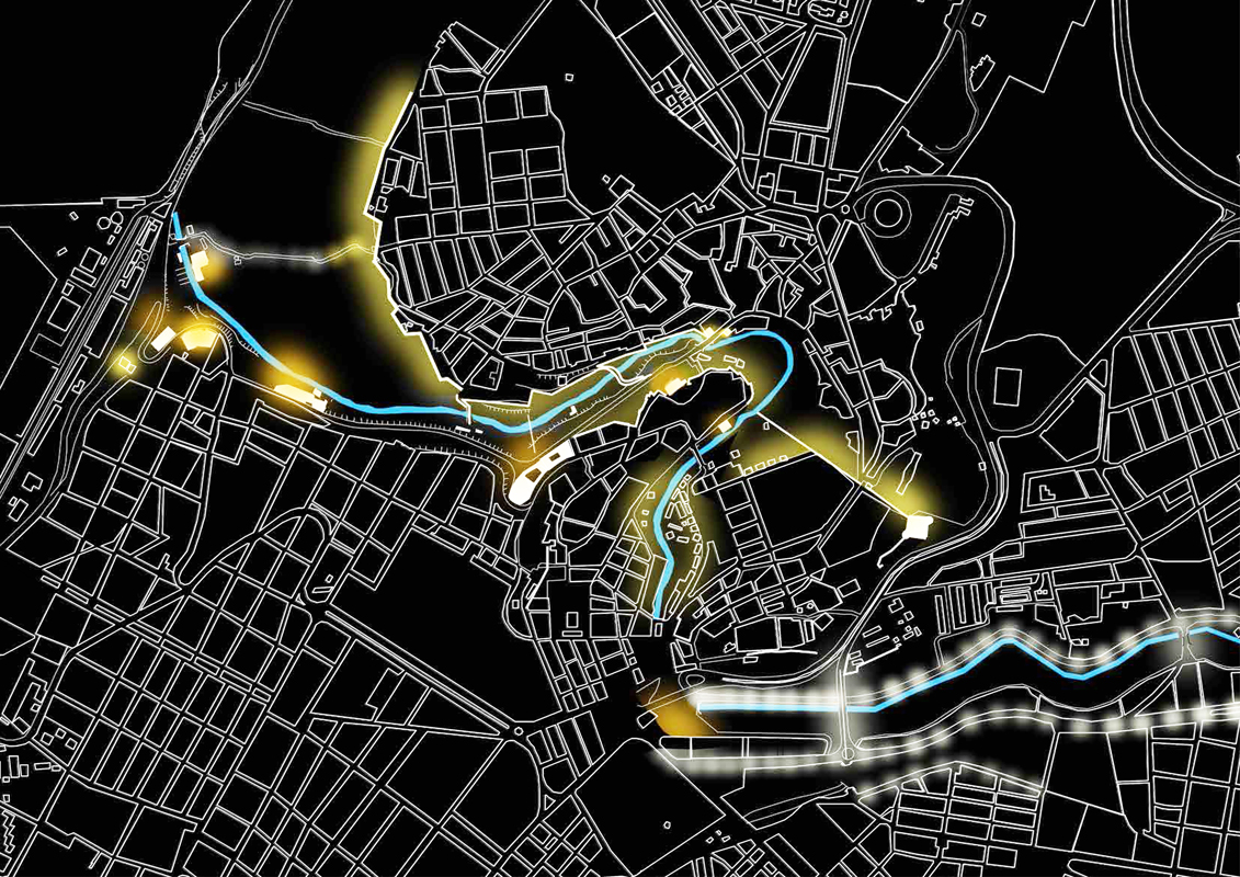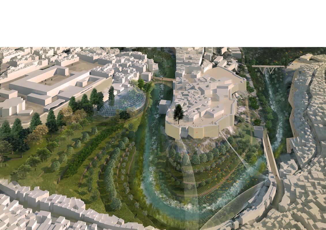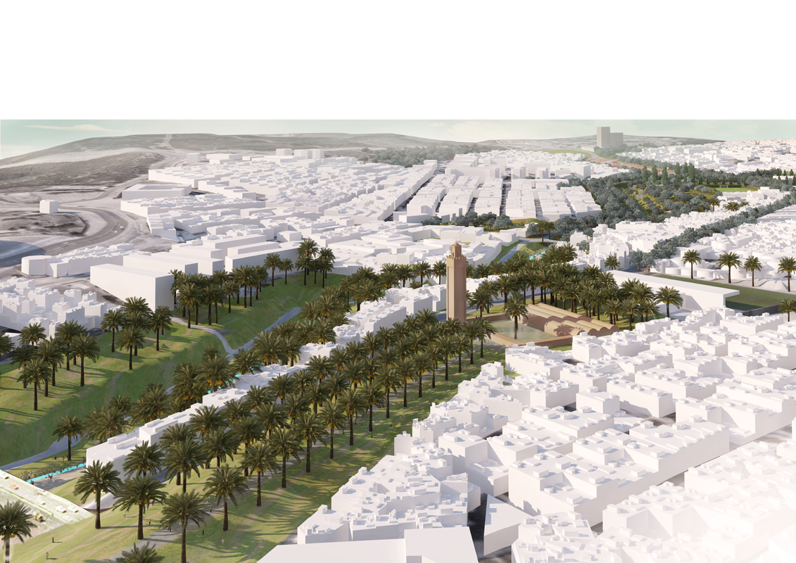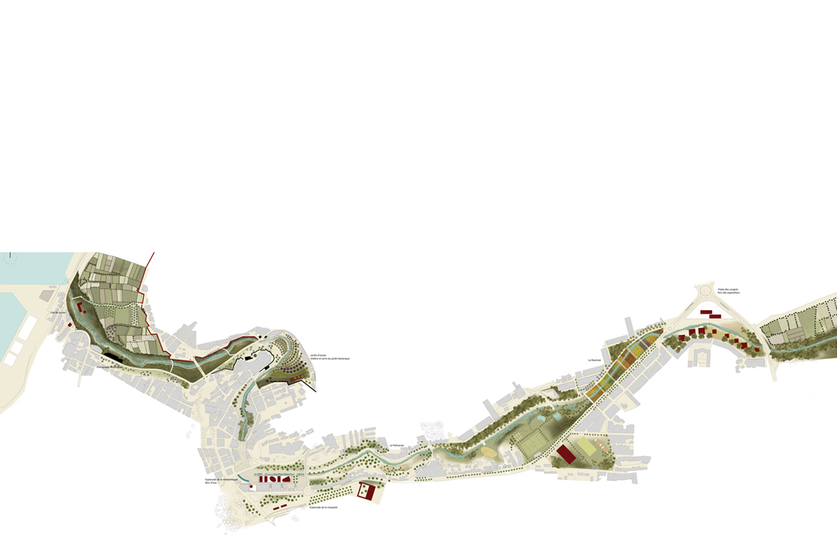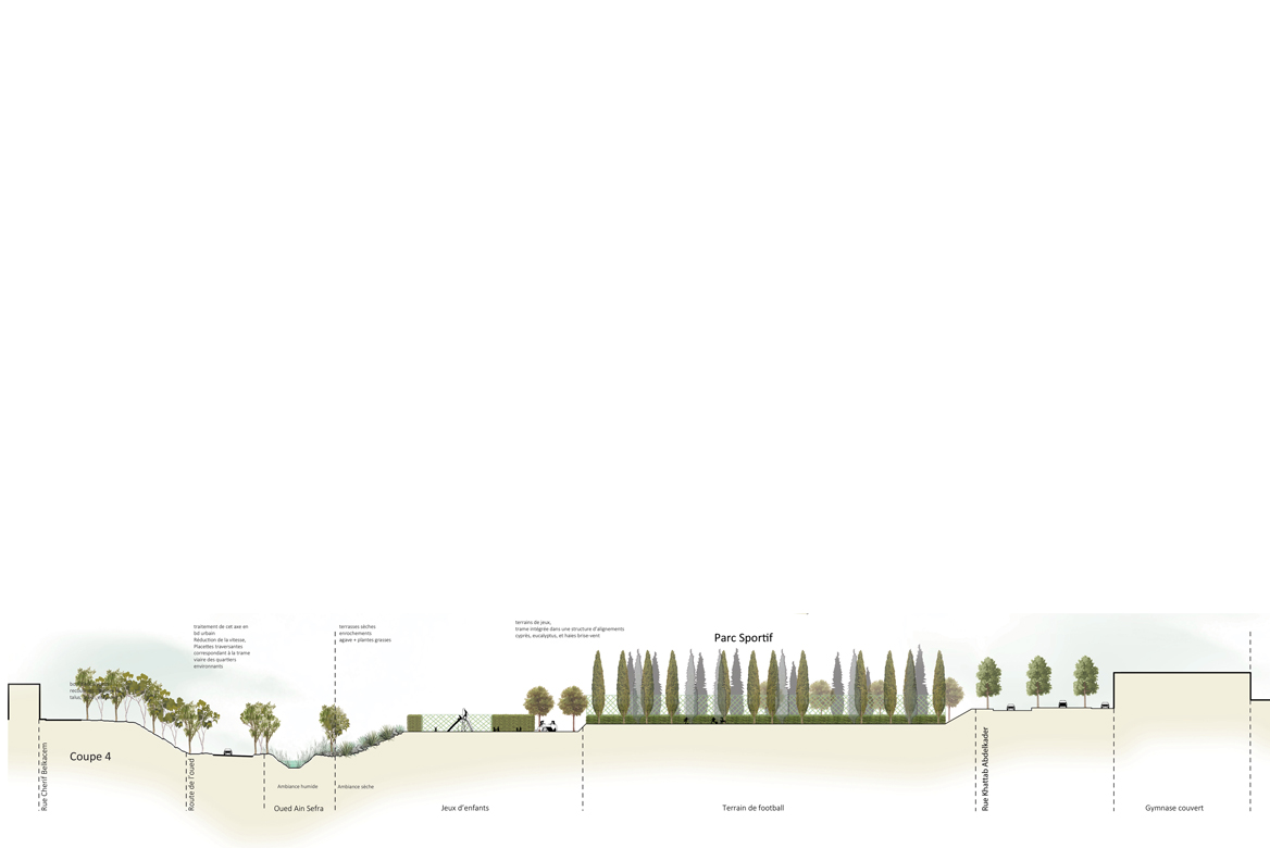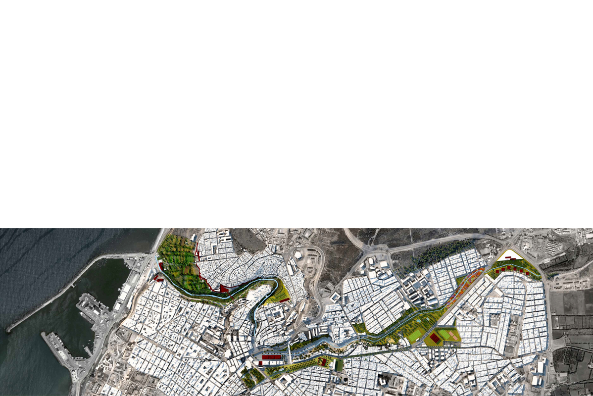 In partnership with Christoph Laforge and Artelia. The proposal for the rehabilitation of Oued Ain Sefra is based on the cultural heritage and landscape qualities of the site. The Valley becomes a linear park linking the two sides of the city instead of being a barrier and a negative space separating the neighborhoods of Tigdit and Tobana. It also links the see with the old city and the new suburban neighborhoods. The river becomes the center and the primary thread of the touristic development of the city.