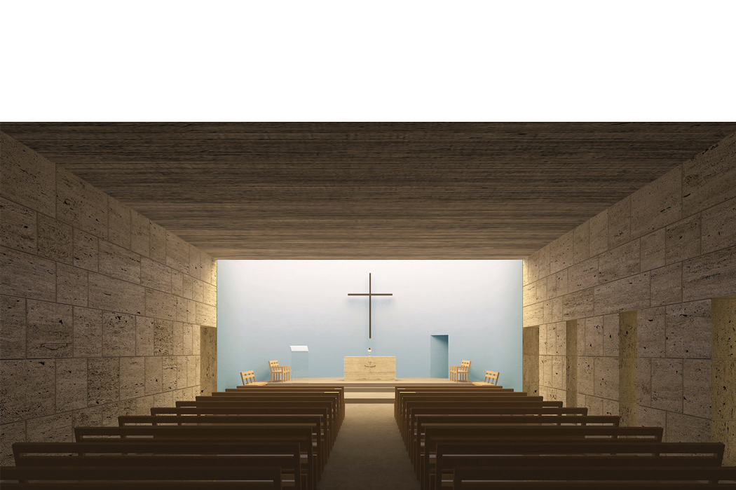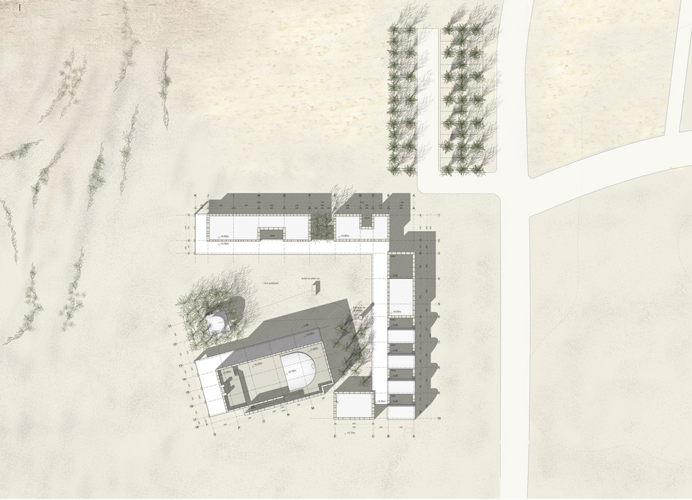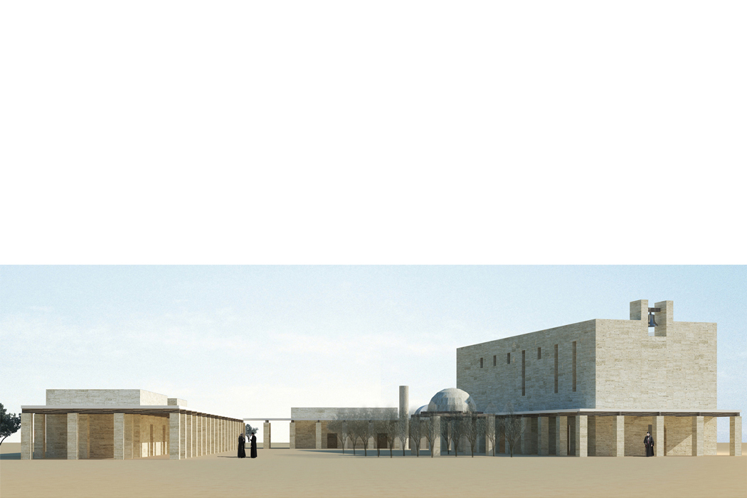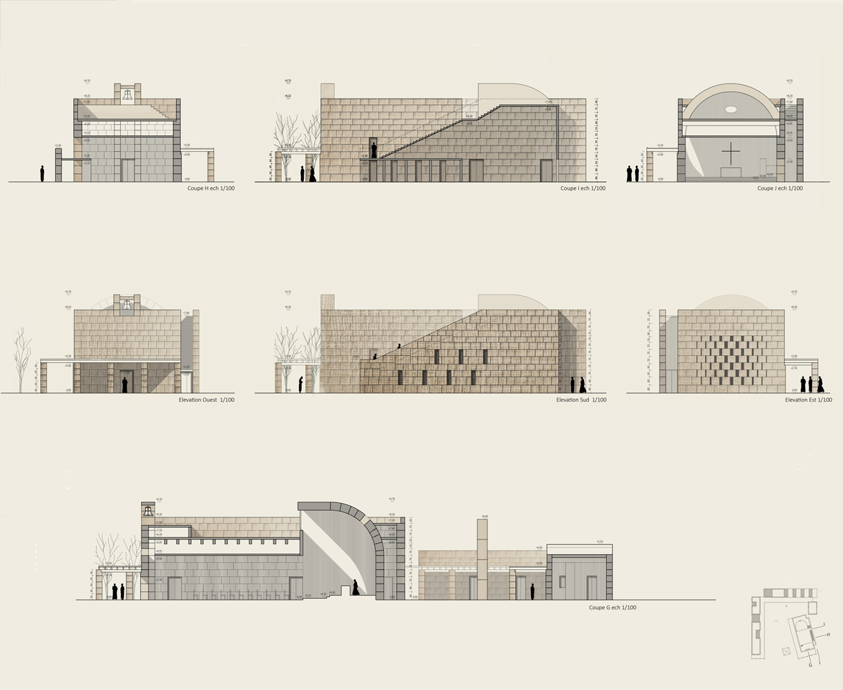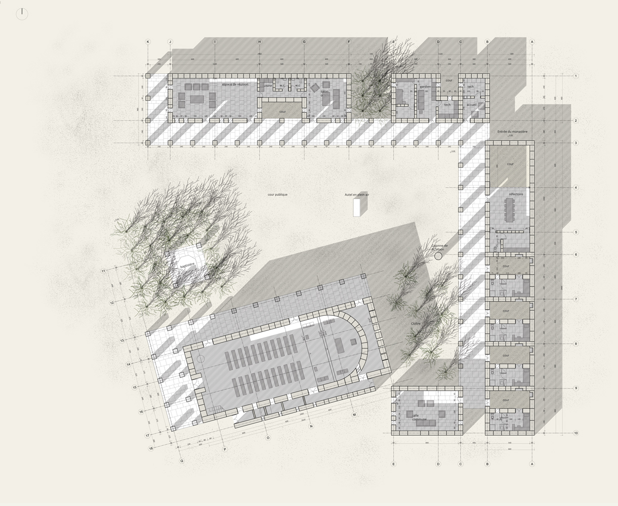 The project is centered around a courtyard articulating the different elements of the pilgrimage site. On the North and West sides, an L-shaped gallery links the convent, administration and public pilgrimage functions of the site. The church, positioned on the Southern side, completes this composition and simultaneously ensures the shading of the courtyard. The Eastern side of the gallery shelters the houses of the monks, articulated as four cells each accessed via its own courtyard.