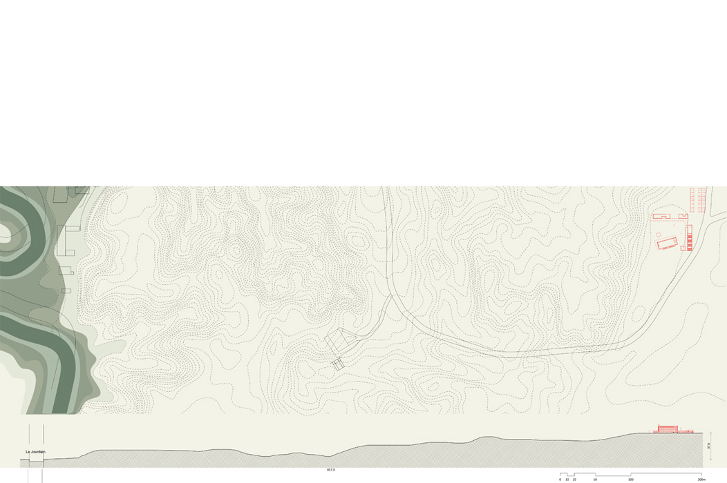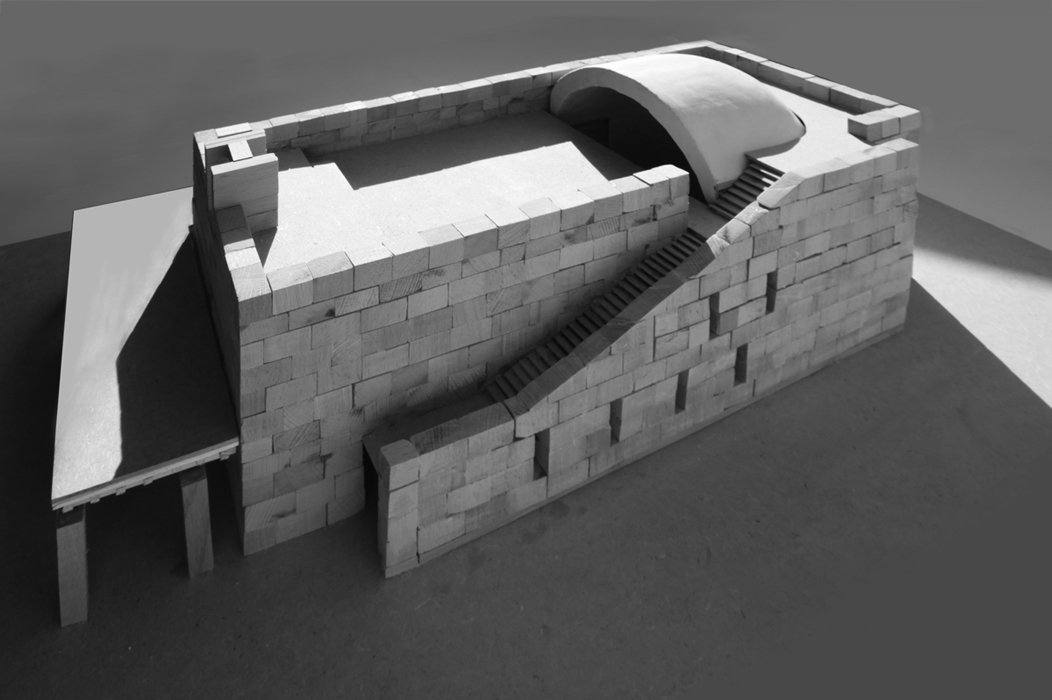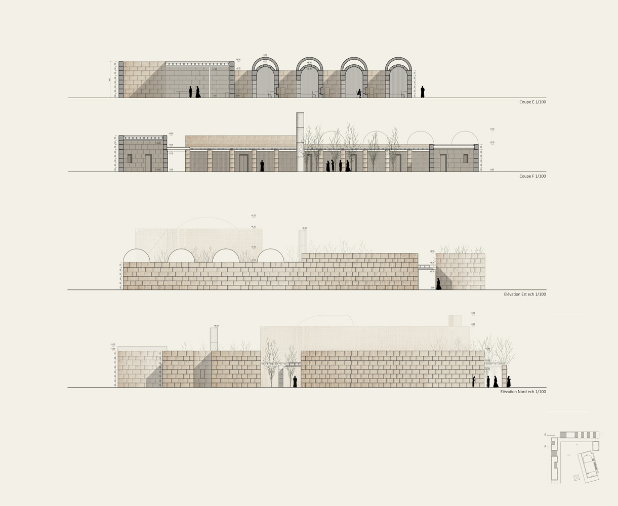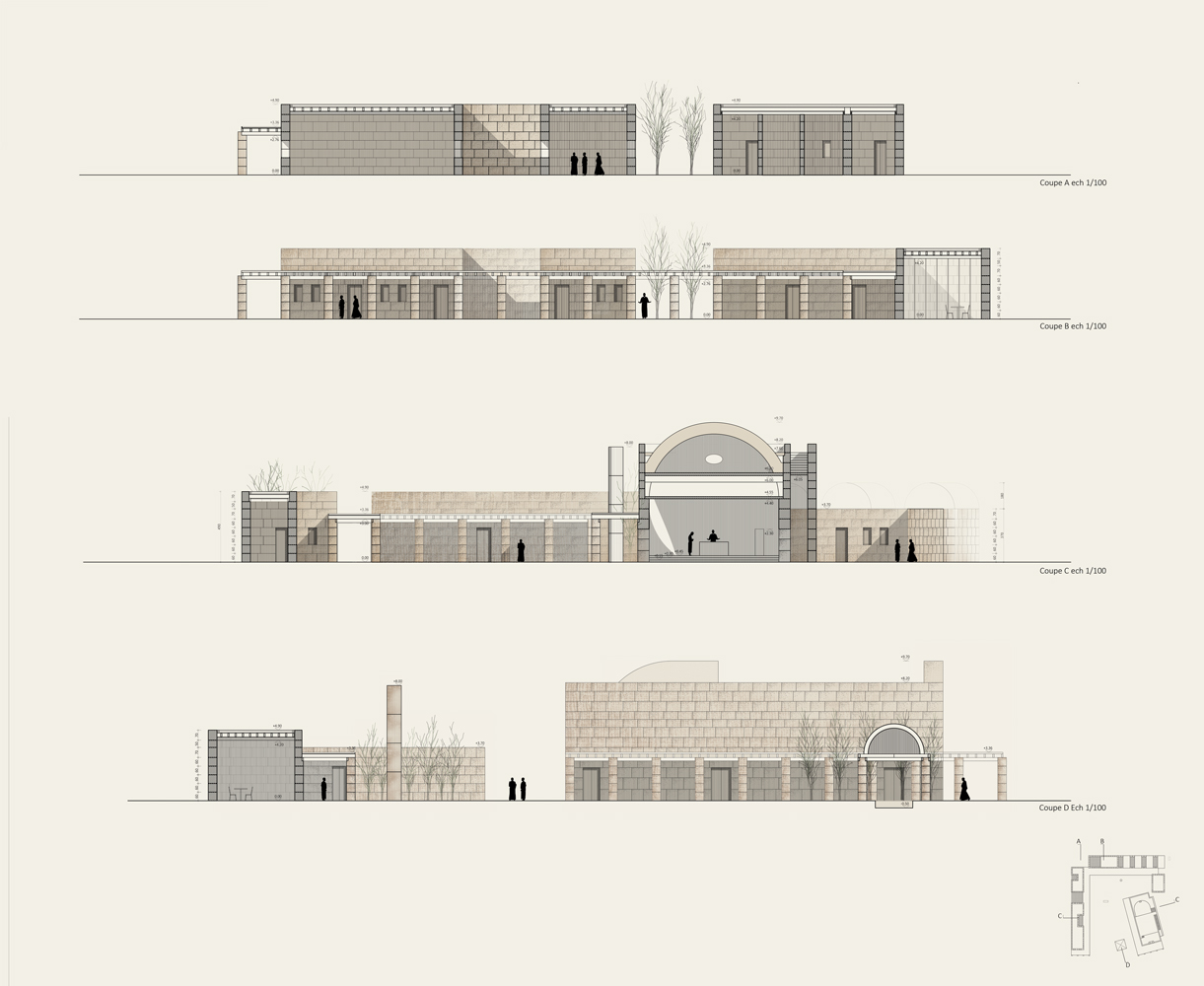 The project is centered around a courtyard articulating the different elements of the pilgrimage site. On the North and West sides, an L-shaped gallery links the convent, administration and public pilgrimage functions of the site. The church, positioned on the Southern side, completes this composition and simultaneously ensures the shading of the courtyard. The Eastern side of the gallery shelters the houses of the monks, articulated as four cells each accessed via its own courtyard.