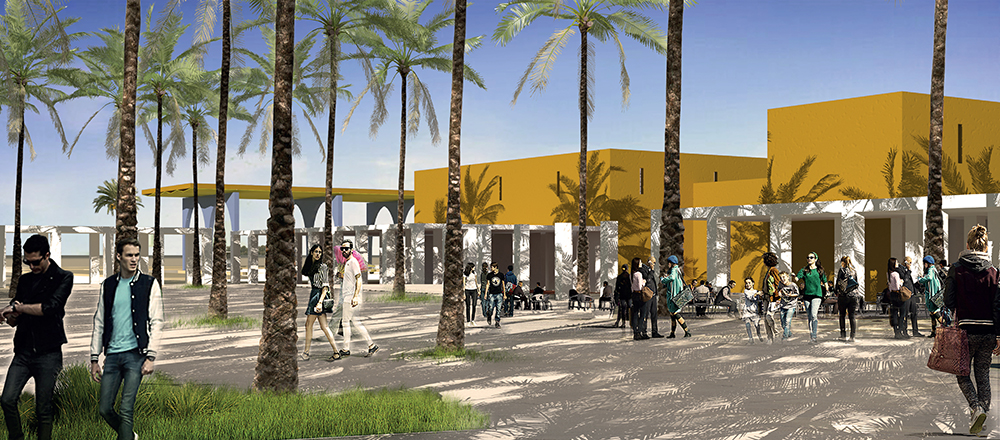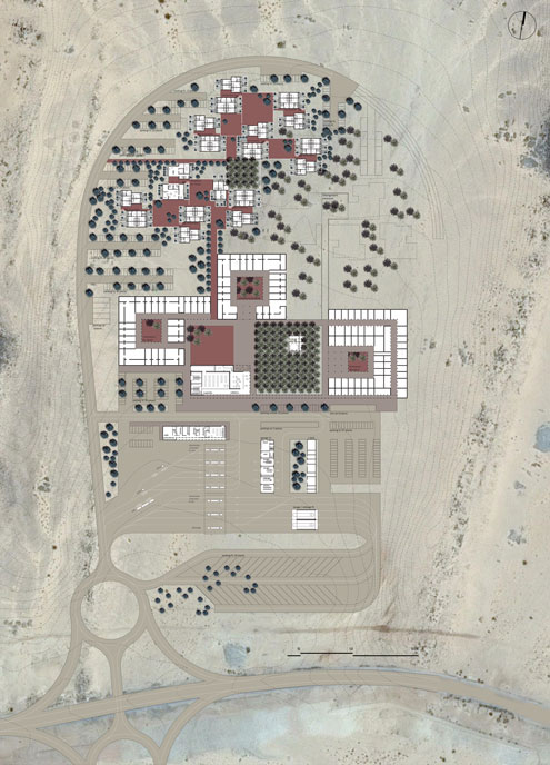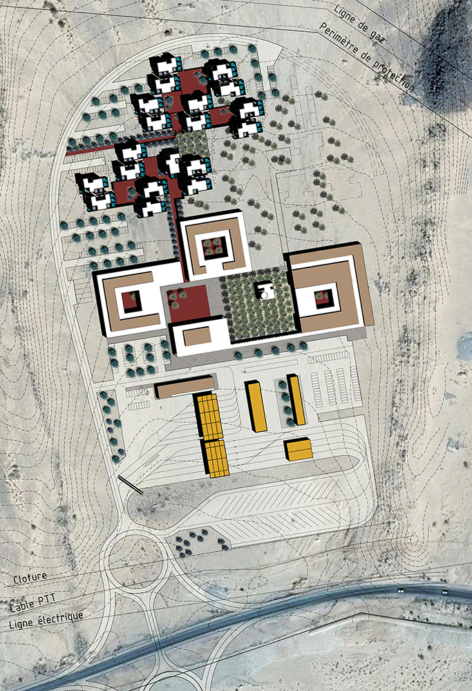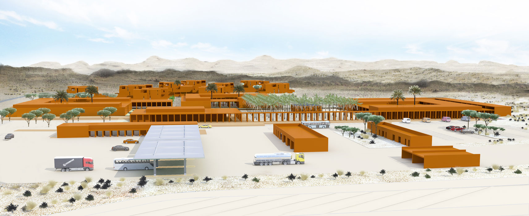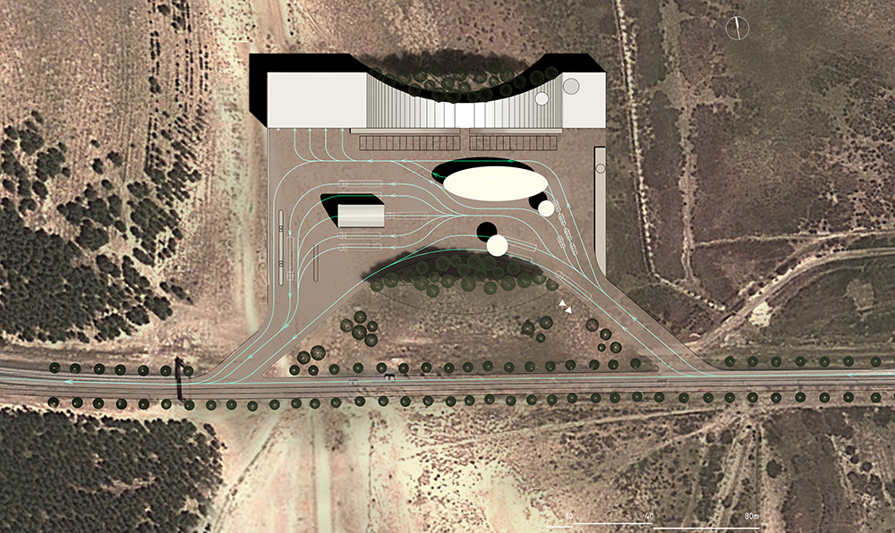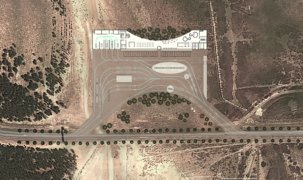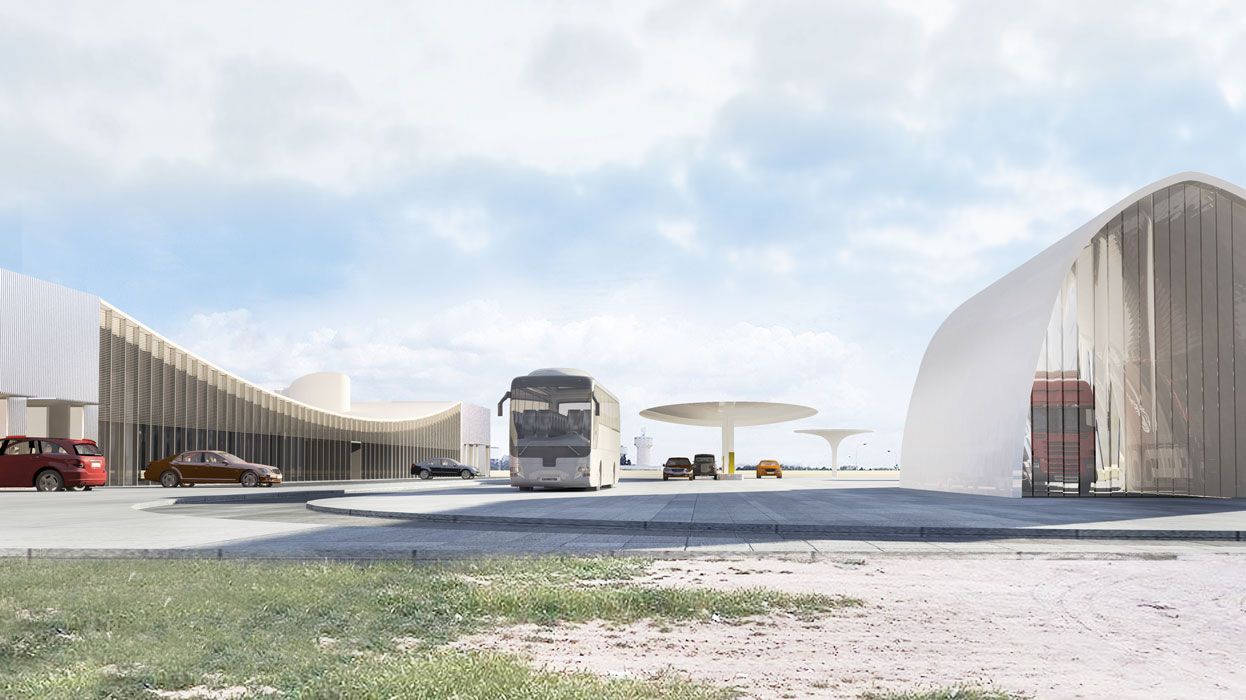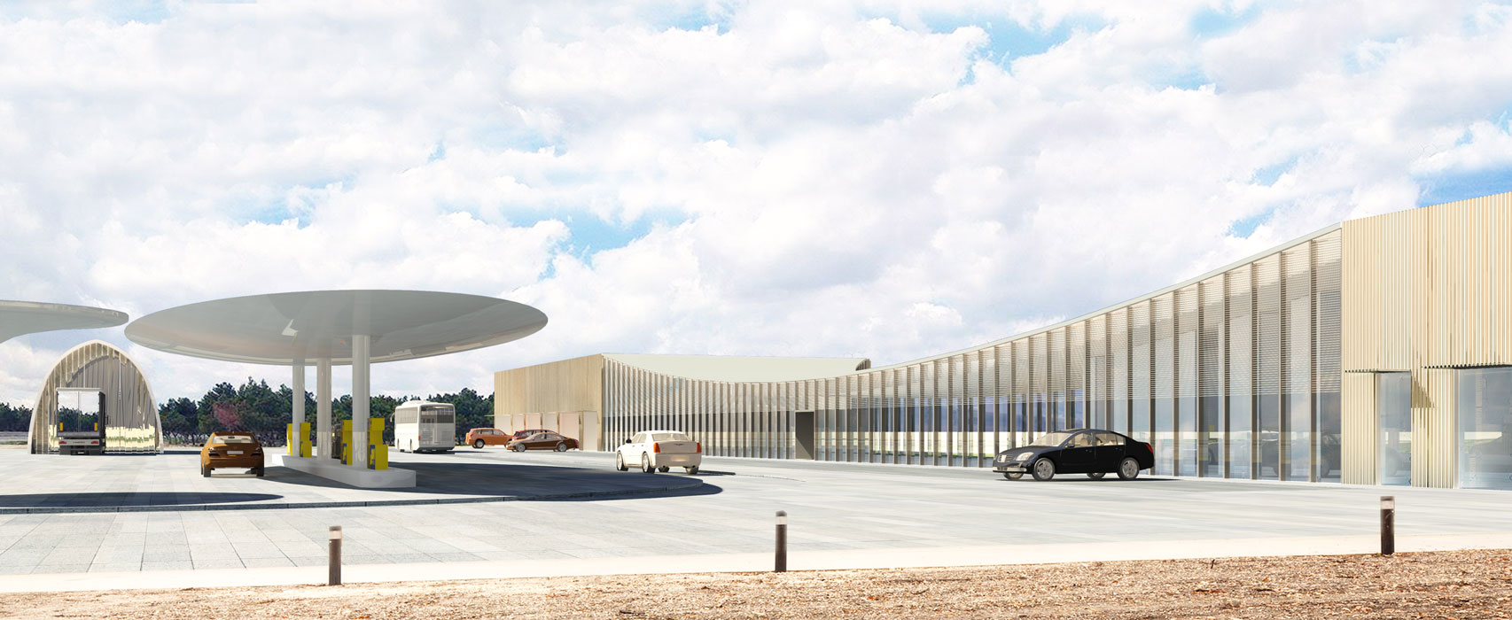 The project is a research on a 4th generation of motorways gas-station relay and rest areas. Today the notion of a gas station extends much further than the simple concept of it being a rest area for a quick meal in the middle of a remote landscape. It is the place for a new urbanity that creates an interface between the territorial scale of the highways and the local scale of the countryside. It allows a direct contact between the travelers and the local population, generating an exchange of goods and services. The road will not deplete the countryside but offers services like warehousing, health services, and markets. The countryside offers its products, food and beverage, lodges, and various other amenities. The typologies must adapt to different situations, at the entrance of cities or in the middle of the desert, and be able to evolve and grow in reference to the local demand. In order to manage the change of scale, the project uses a reflection on the ideas of the Istiraha, Funduq, and Khan.