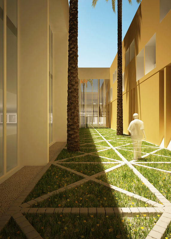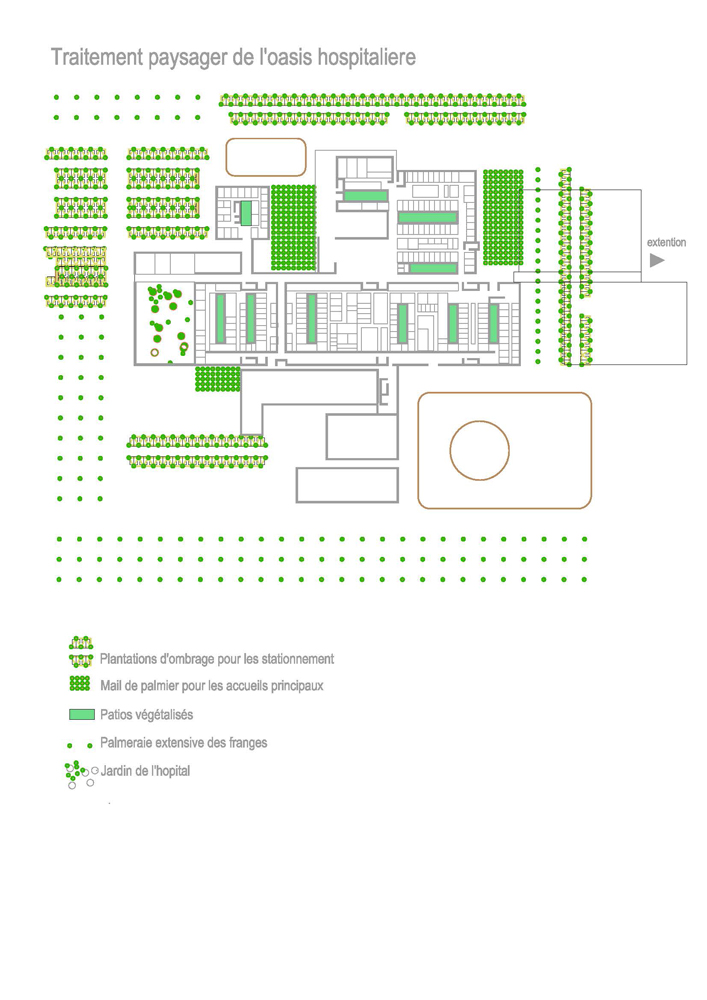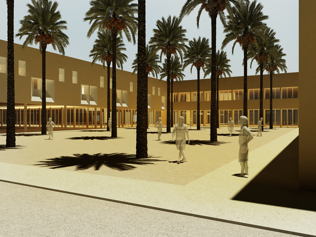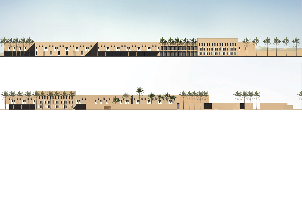 In partnership with Claude Montfort. The healthcare complex is set at the entrance of the city of Ouargla. Its main façade is oriented towards the North-East, facing the city. It’s north-western façade, directed towards the national highway, is a closed garden. The administration building is elevated from the main hospital building and represents public service and indicates the entrance. The public square, planted with palm trees, also orients the public towards the entrance. The materials recall the site’s natural colors, ochre and white. The palm trees lend the site the comfort of a medical oasis.