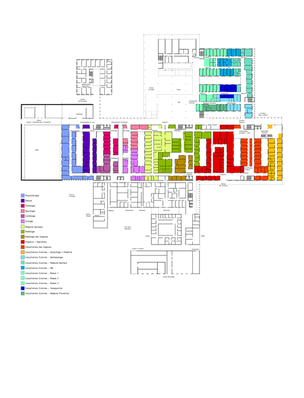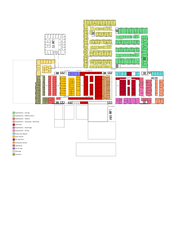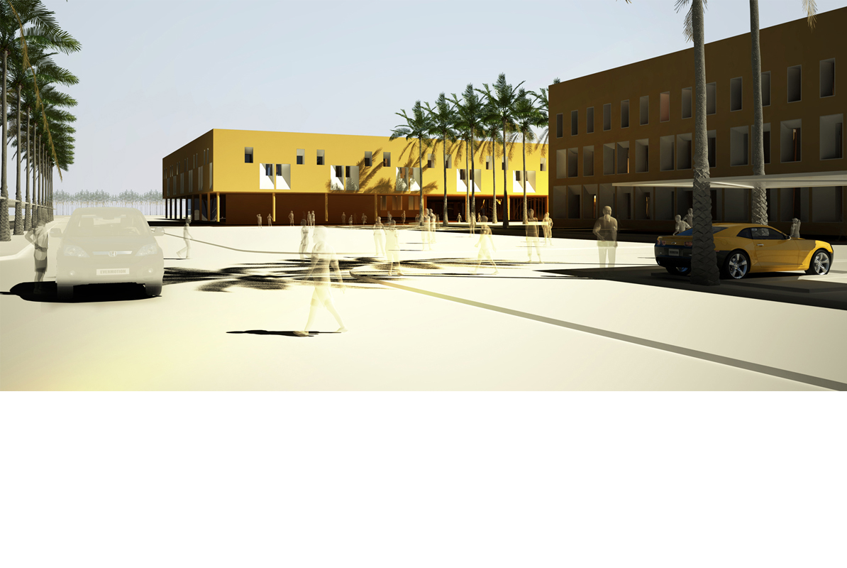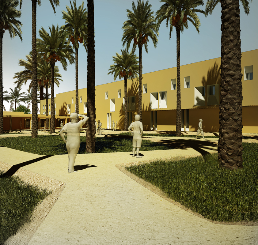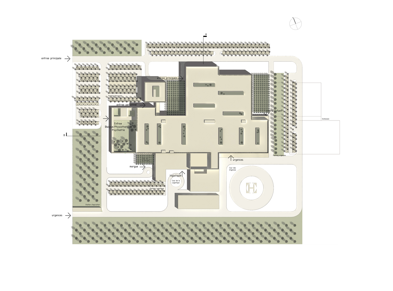In partnership with Claude Montfort. The healthcare complex is set at the entrance of the city of Ouargla. Its main façade is oriented towards the North-East, facing the city. It’s north-western façade, directed towards the national highway, is a closed garden. The administration building is elevated from the main hospital building and represents public service and indicates the entrance. The public square, planted with palm trees, also orients the public towards the entrance. The materials recall the site’s natural colors, ochre and white. The palm trees lend the site the comfort of a medical oasis.
