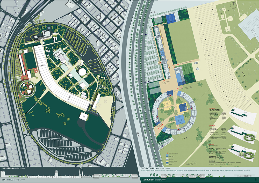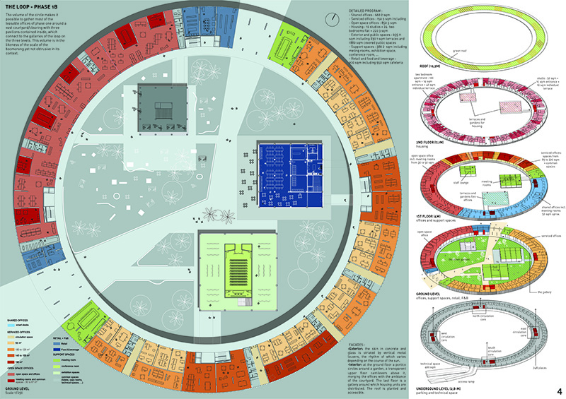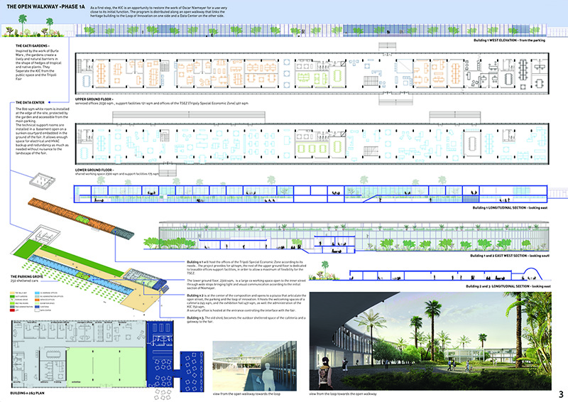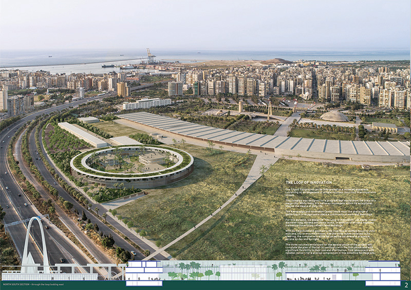 In association with Seura Architectes. The Tripoli Fairground can be interpreted as a modeled esplanade containing an arrangement of simple volumes inscribed in an expansive ellipse. This complex was designed for a program that would meet the scale of a mega-city. While today it is set to accommodate within its exceptional shapes the means of daily life. The Knowledge and Innovation Center could meet the challenge of gathering in a recognizable place a community of work and dwellings. For this purpose, we designed “The Loop of Innovation”, a 3-stories high and 80-meter-diameter wide ring, up to which an open walkway leads, framed by the two existing and rehabilitated buildings. With the magnitude and geometry of the ring, the insertion of housing units with views to the city, mountains and the sea, and the inclusion of three cubic volumes in its central clearing, the complex allows for an active yet peaceful presence, serene by day and by night.